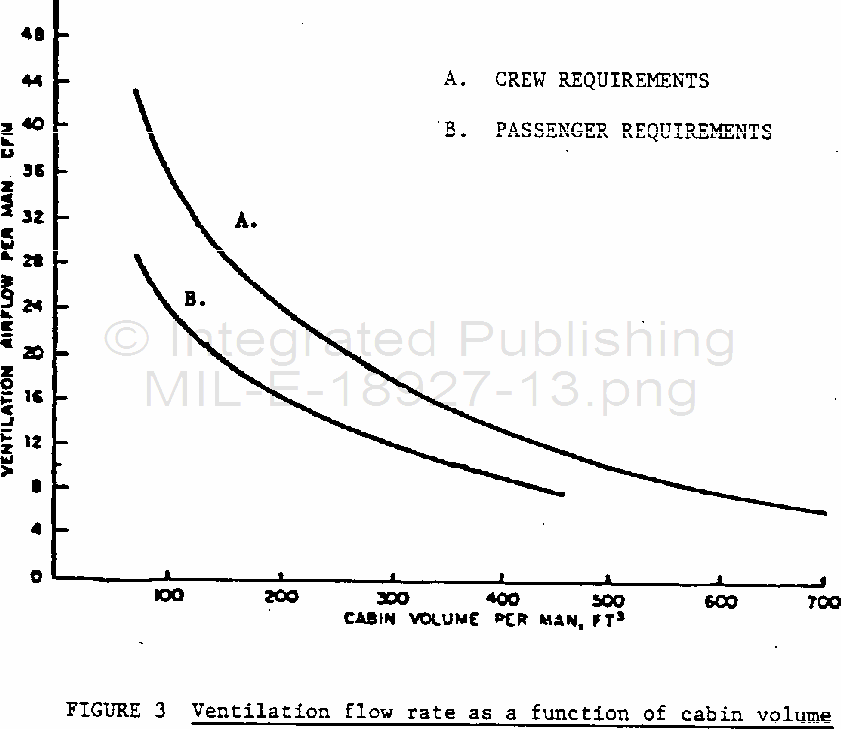 MIL-E-18927 Environmental Control Systems, Aircraft, General Requirements ForThis specification establishes the general requirements for design and performance of aircraft Environmental Control Systems (ECS) required for occupied spaces and equipment. It includes pressurization, heating, cooling, ventilating, moisture control, bleed air system, ram air supply, pressure and anti-G suit systems, defogging, defrosting, anti-icing, rain removal, electronic/electrical equipment environment, boundary layer control and related systems.